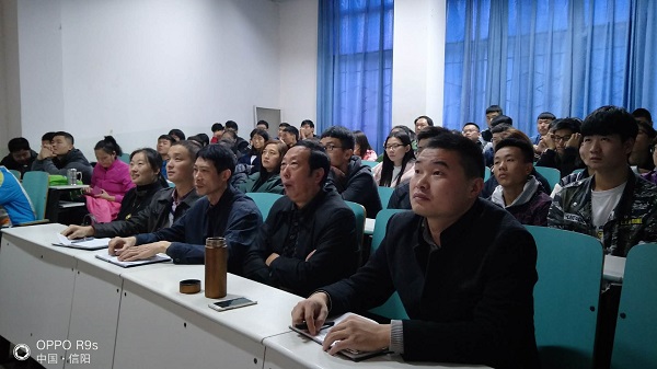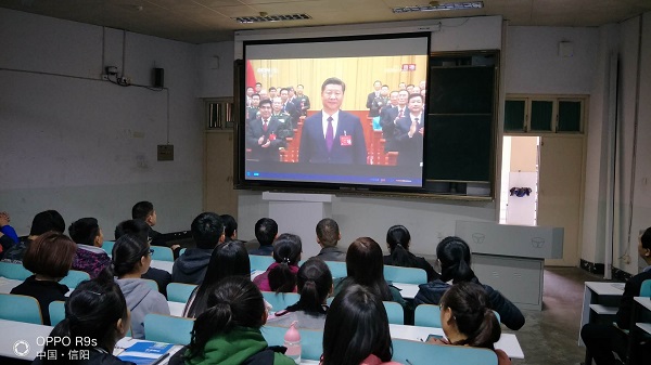 10月18日上午9:00,pg娱乐电子游戏官网入口党委书记陈青、院长余道明带领该时段没有课的教师、学生90余人在文科楼109观看了十九大开幕会。