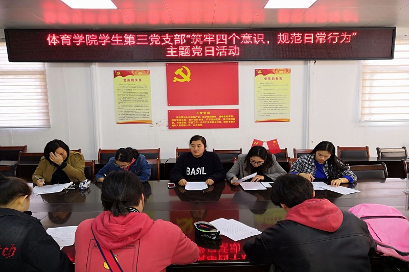 2018年10月31日中午,pg娱乐电子游戏官网入口学生第一党支部、第二党支部、第三党支部分别在pg娱乐电子游戏官网入口三楼会议室和人文楼109教室举行了“筑牢四个意识,规范日常行为”的主题党日活动。