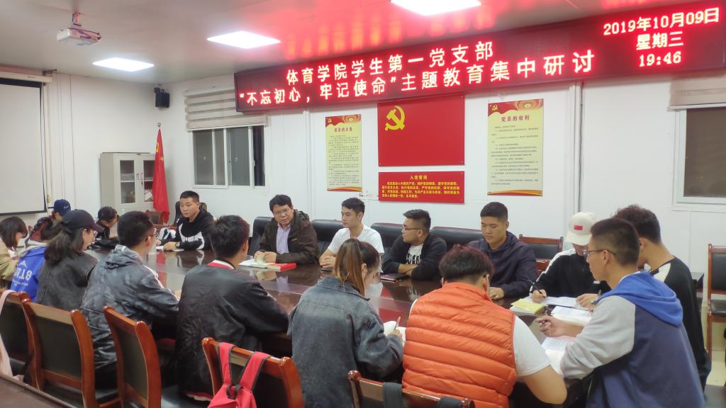 2019年10月9日晚上,pg娱乐电子游戏官网入口学生第一党支部“不忘初心、牢记使命”主题教育集中研讨活动在pg娱乐电子游戏官网入口三楼会议室举行。pg娱乐电子游戏官网入口副处级辅导员、学生第一党支部书记柴九昌、学生第一党支部全体党员参加研讨,研讨由柴九昌主持。