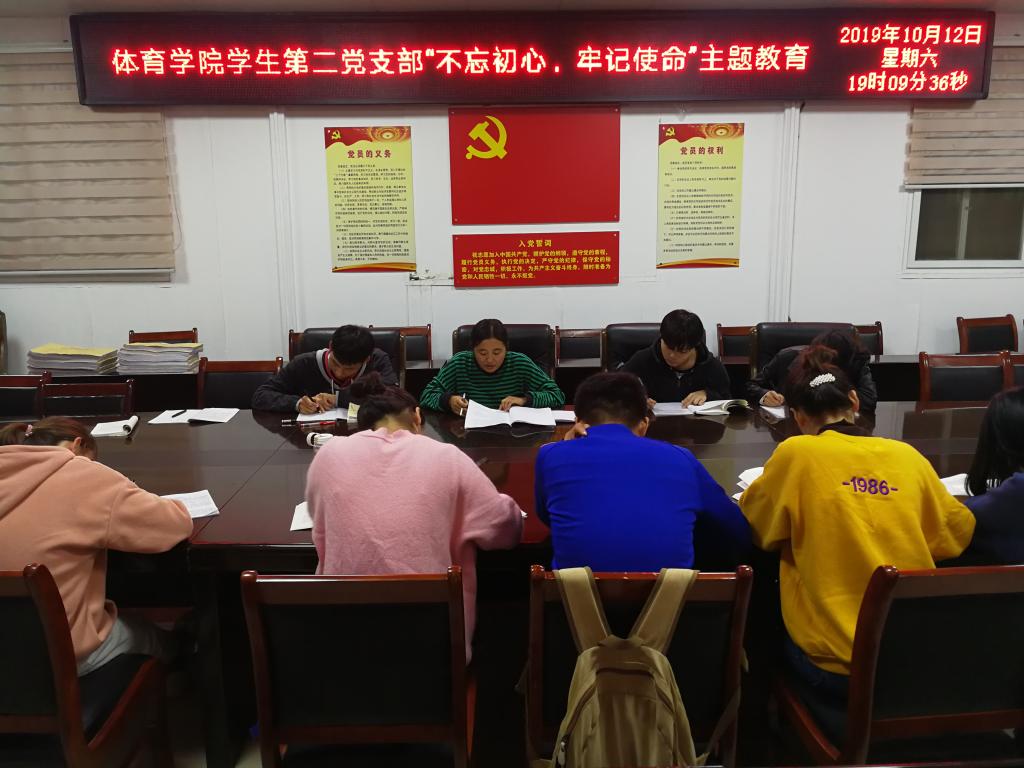 2019年10月12日晚上,pg娱乐电子游戏官网入口学生第二党支部“不忘初心、牢记使命”主题教育专题党课在pg娱乐电子游戏官网入口三楼会议室举行,学生第二党支部书记赵倩倩、二支部全体党员参加会议,赵倩倩主持会议。