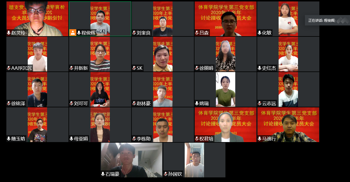 2020年5月23日,pg娱乐电子游戏官网学生第三支部召开讨论预备党员转正大会,全体党员参加会议,会议由学生第三支部书记程俊辉主持。