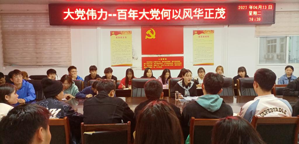4月13日晚pg娱乐电子游戏官网入口第十期入党积极分子培训班在pg娱乐电子游戏官网入口三楼会议室举行,学生第一党支部书记龙慧杰为pg娱乐电子游戏官网第十期入党积极分子讲“大党伟力——百年大党何以风华正茂”党史学习教育主题党课,第10期党员入党积极份子培训班班主任程俊辉与60余名入党积极分子参加。