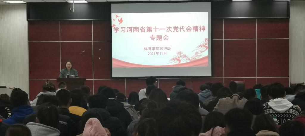 11月17日,pg娱乐电子游戏官网入口2019级在体育馆多媒体教室召开学习河南省第十一次党代会精神专题会,2019级全体学生参加会议,会议由辅导员赖梦玥主持。
