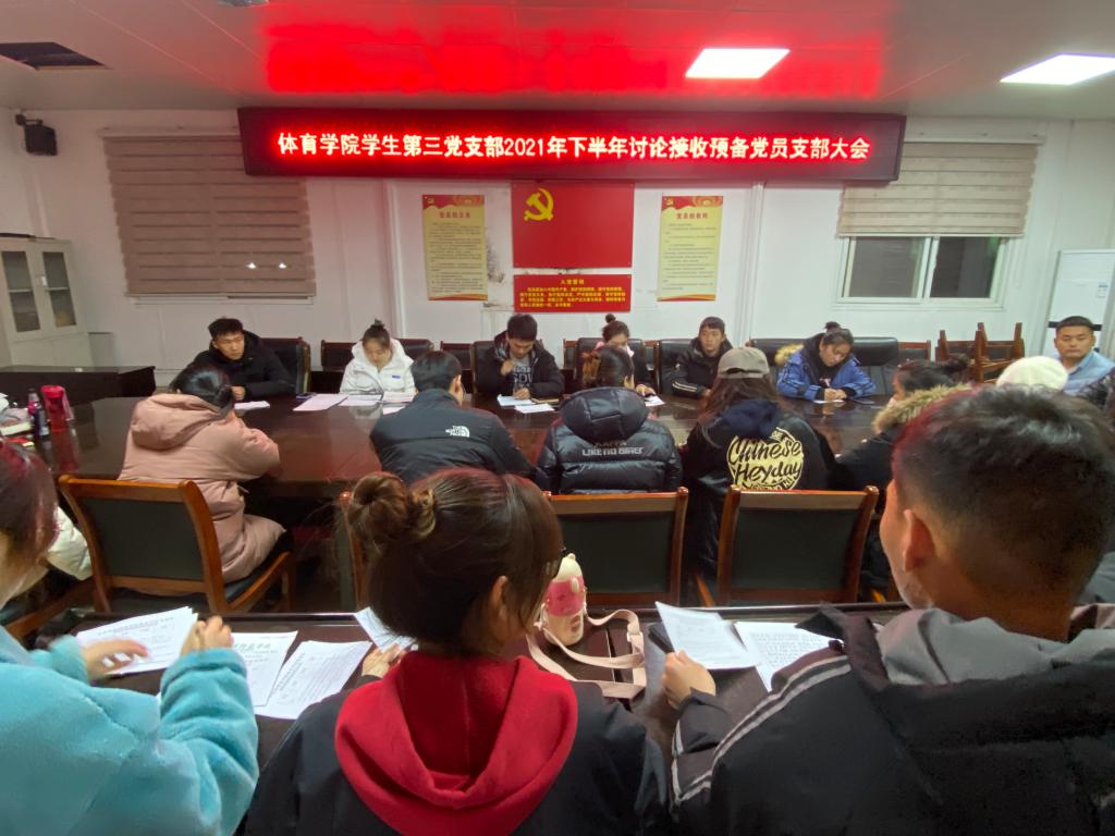 12月2日晚,pg娱乐电子游戏官网入口学生第三党支部成员于体育楼3楼会议室召开讨论接收预备党员支部大会。会议由学生第三党支部书记程俊辉同志主持,支部全体党员以及本次发展对象参加本次会议。