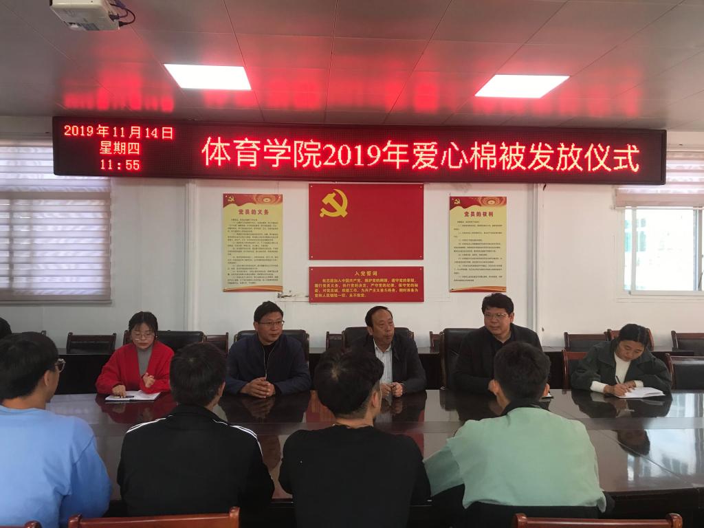 2019年11月14日pg娱乐电子游戏官网入口在三楼会议室开展“寒冬送温暖”棉被发放仪式。党委书记陈青、副院长牛林杰、副处级辅导员柴九昌、辅导员赵倩倩、赖梦玥出席棉被发放仪式。棉被发放仪式上,首先由柴九昌老师讲明发放棉被的目的、受助同学的评选标准。接着,柴老师对同学们进行感恩教育,一床棉被很小,但是这床棉被了灌注了学校、学院对同学们的关心与爱护。不仅如此,这床棉被还教会同学们做个学会感恩、懂得感恩的人,并希望同学们以后能在社会中将这份爱传递下去。随后,党委书记陈青发表讲话。陈书记指出,学校历来重视家庭经济困难学生资助工作,学院领导和老师都非常关心家庭经济困难学生的学习和生活。学校会尽最大努力解决生活困难学生的实际问题。最后,陈书记对同学们提出希望,在困境中要拥有乐观的心态,面对困境要有自强不息的精神,立志成才,努力奋斗。