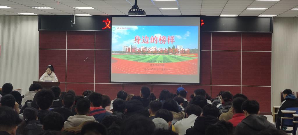 12月19日,由学工处资助管理中心主办,pg娱乐电子游戏官网承办的“身边的榜样”宣讲会在体育馆多媒体教室成功举办。pg娱乐电子游戏官网资助专员、辅导员赖梦玥老师与大一大二全体学生共同聆听本次宣讲会,宣讲会由赖梦玥老师主持。