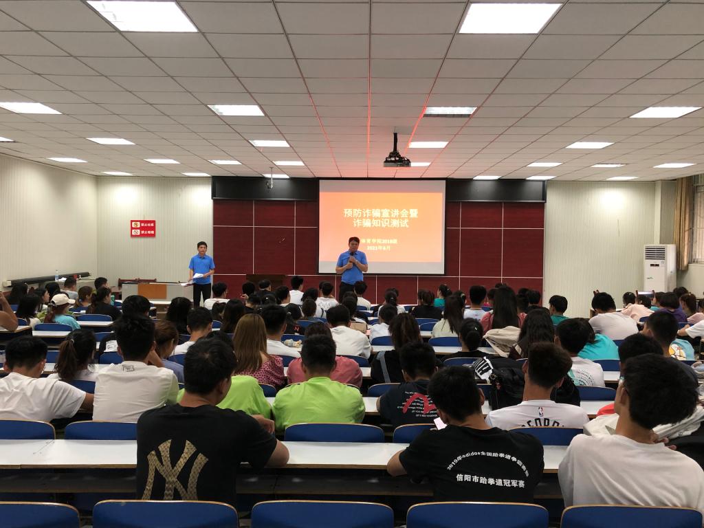 高校电信网络诈骗案件高发频发,为切实提高pg娱乐电子游戏官网学生防范意识与能力,维护学生的财产安全,6月21日下午6点在体育馆多媒体召开“预防诈骗宣讲会暨诈骗知识测试”大会,2018级全体同学参加,本次宣讲会由副处级辅导员柴九昌主讲,2018级辅导员程俊辉主持。