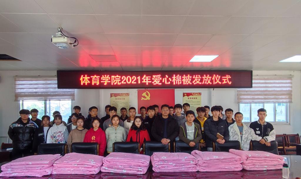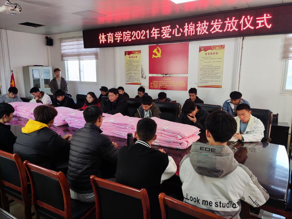 11月26日12时,pg娱乐电子游戏官网入口在三楼会议室举行2021年爱心棉被发放仪式。pg娱乐电子游戏官网入口副书记柴九昌、18级辅导员程俊辉、资助专员赖梦玥和部分学生代表出席此次活动。