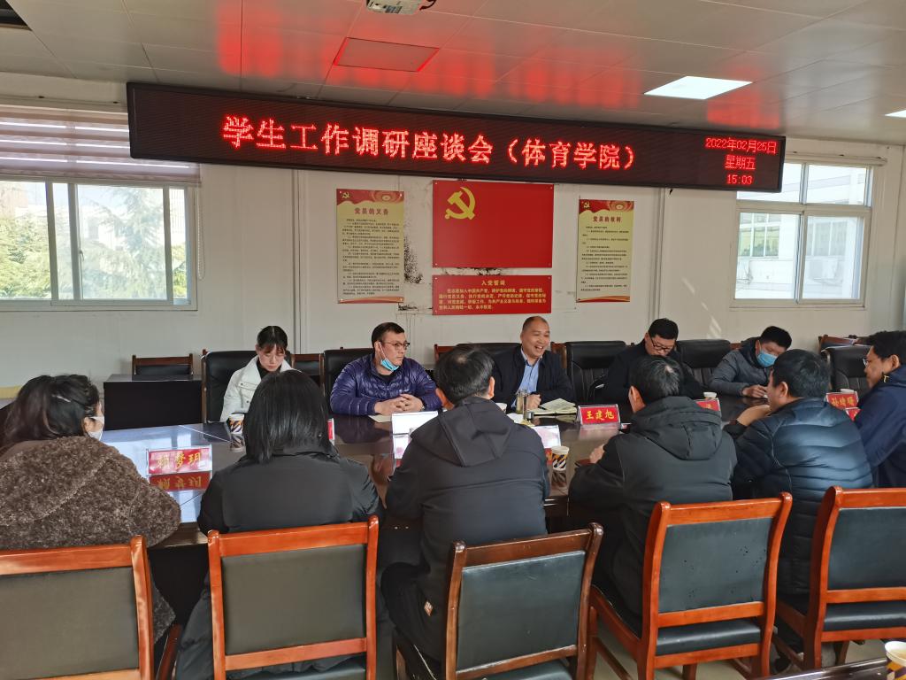 2月25日,学生处处长王建旭,副处长雷梁,国防科科长陈颢文、管理科科长孙绪曙莅临pg娱乐电子游戏官网调研学生工作。pg娱乐电子游戏官网入口党委书记张晓峰,院长余道明,副书记柴九昌,副院长牛林杰、张翔、张娟、杨晶伟与王建旭处长一行在三楼会议室进行了座谈。参加座谈的还有pg娱乐电子游戏官网行管人员及全体辅导员。座谈会由张晓峰主持。