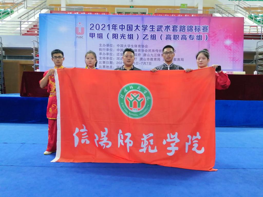 2021年中国大学生武术套路锦标赛于7月5至7日在河北省迁安市举行。本次赛事由中国大学生体育协会主办、河北省教育厅、迁安市人民政府承办,全国高校共有92支队伍,700余人参加了本次比赛。信阳师范学院武术队由牛林杰老师担任领队,罗杰老师担任教练员。经过三天的激烈角逐,最终获得单项2金1银的优异成绩。