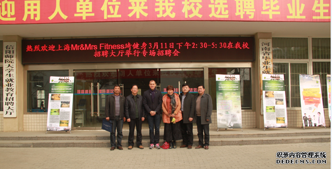 3月11日,在校招就处的支持下,应信阳师范学院pg娱乐电子游戏官网入口邀请,上海Mr&Mrs Fitness琦健身有限公司总经理周文译、副总经理蔡锦鸿、人事总监金正琪等一行来到我校,在逸夫楼招聘大厅为pg娱乐电子游戏官网入口学生举行了一场专场招聘会,吸引了pg娱乐电子游戏官网入口2011级190多名毕业生参加,pg娱乐电子游戏官网入口院长王小美,副院长梁超勋,总支副书记严彬等老师到现场为同学们答疑解惑;校招生就业处处长刘守义,副处长郭鹏到场为同学们加油助威,并看望了招聘人员,对pg娱乐电子游戏官网入口组织这样的招聘会进行了充分肯定。