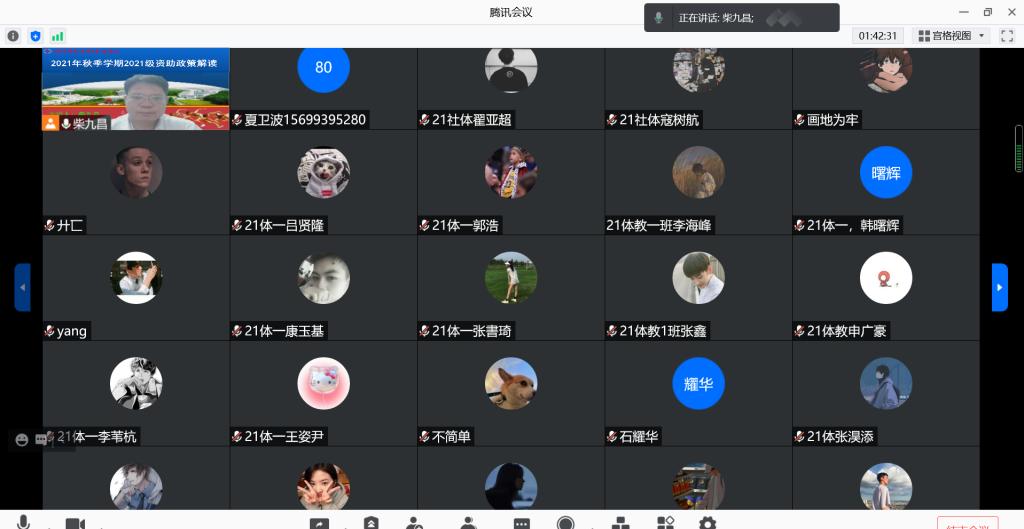 9月22日上午9点,pg娱乐电子游戏官网通过线上方式成功召开了2021级新生资助政策宣讲会。体院学院副书记柴九昌担任宣讲会主讲,21级全体新生参加此会议。
