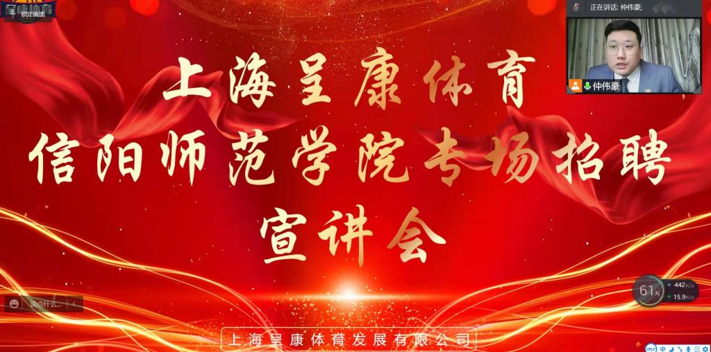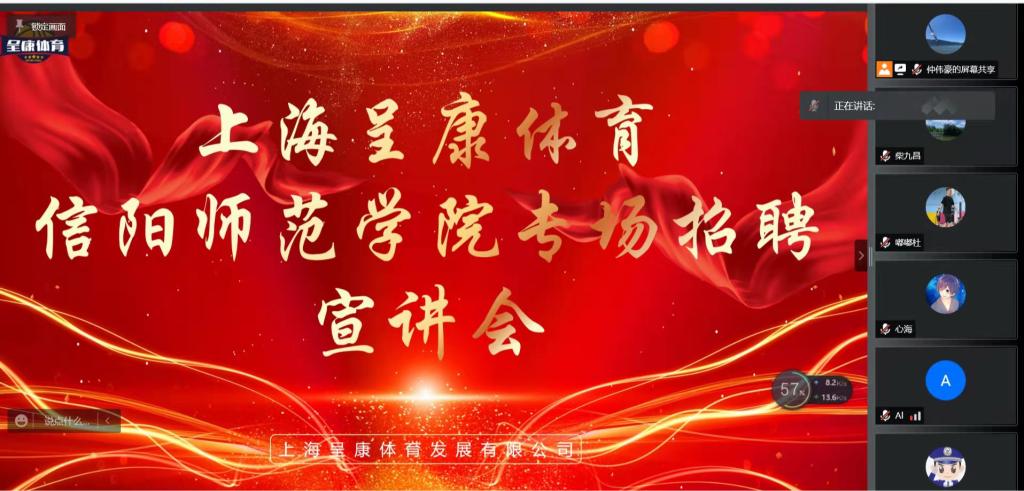 3月22日,上海呈康体育-信阳师范学院线上专场宣讲会顺利召开。pg娱乐电子游戏官网入口党委副书记柴九昌、毕业班班主任、就业秘书以及全体毕业生参加会议。