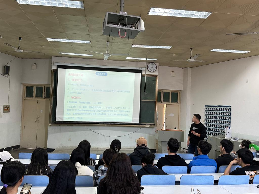 本次讲座邀请莘高教育市场部负责人任老师作主题讲座,他从河南省公务员招考的政策、考试流程展开讲解,分别为大家介绍了选调生、三支一扶、特岗教师、招教考试的内涵、考试流程、内容、报名时间等相关内容。