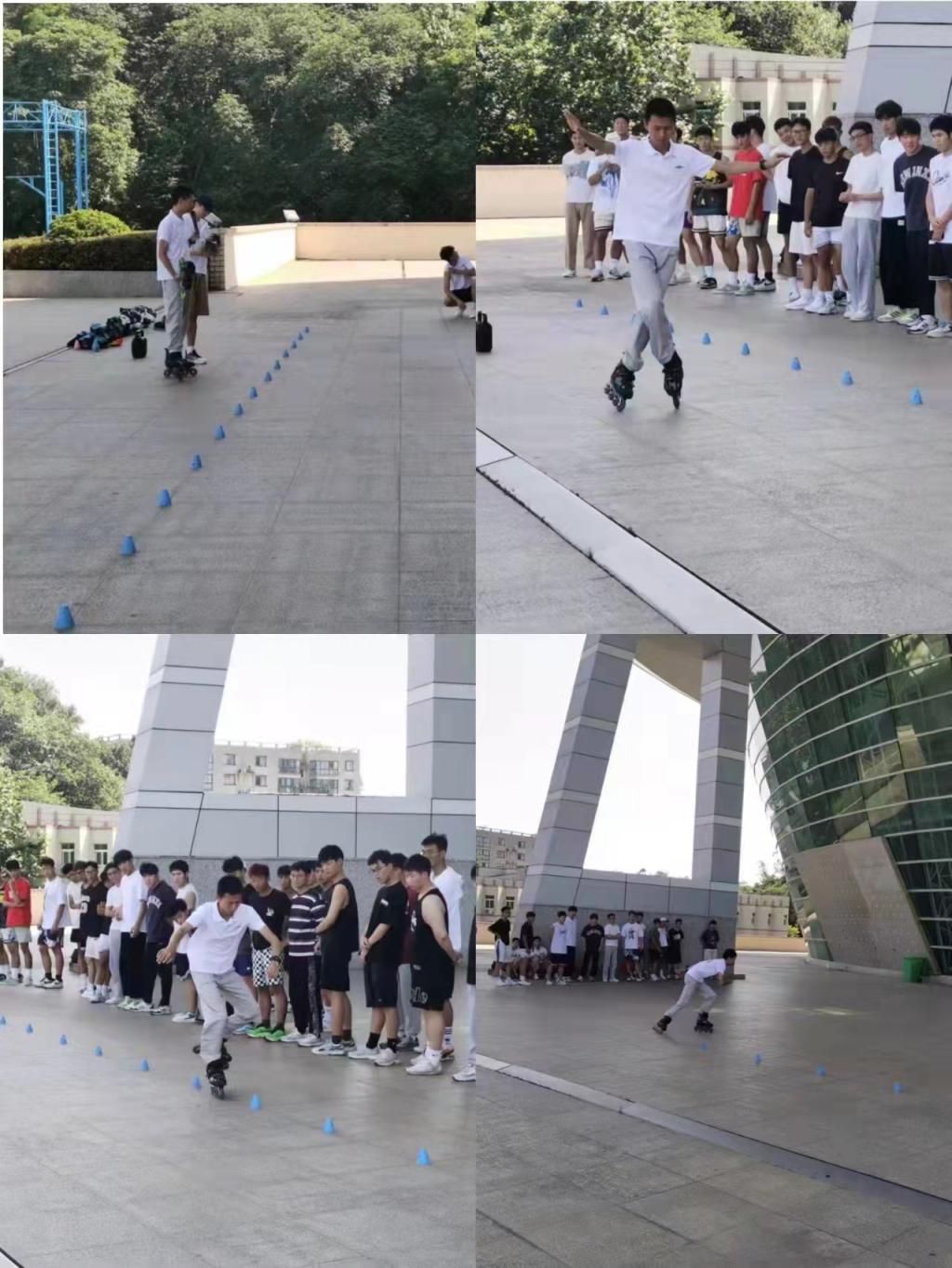 课堂第一部分,胡西昌老师技能示范,带领同学们进行一系列基本的轮滑动作训练,如平衡、滑行、滑转等;耐心解释和指导,帮助学生掌握正确的技巧和动作,保证安全。课堂第二部分,学生自主练习,在轻松的氛围中逐渐掌握轮滑技能,增强身体素质,促进交流和合作精神。